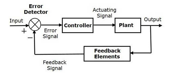 Input is the value the system needs to follow, for example desired temperature in the room. Controller is a controller of a system, a small computer in air condition system. Plant is the system itself. Feedback element is the thermostat that tracks the current temperature. And that circle with X in it is where we subtract desired value from current value, and we get the error value, or in other words, how much we are off.