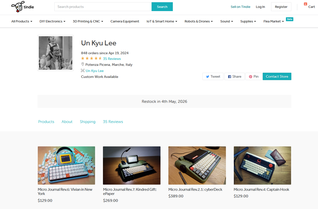 Someone is selling the exact device I'm explaining, maybe a little less bulky in my mind. But the person referred to its name (Micro Journal Rev 3) as if it was well known device. And it probably is on that subreddit. Other people in the comment just continued the conversation as if it's a device like Iphone or Samsung phone. So who is the person that makes these devices? Turns out I have stumbled on him on a website called Tindie.com. It's a market for DIY electronics: