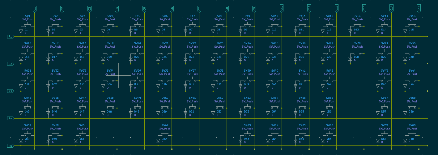 Usually people use Atmega32U4 or RP2040. Those two are the most wide spread, but It's possible to use almost any microcontroller that has enough GPIOs. My choice was Atmega32U4, considering that I have an idea of how to program it. Wiring is simple, just connecting all buttons in columns and rows: