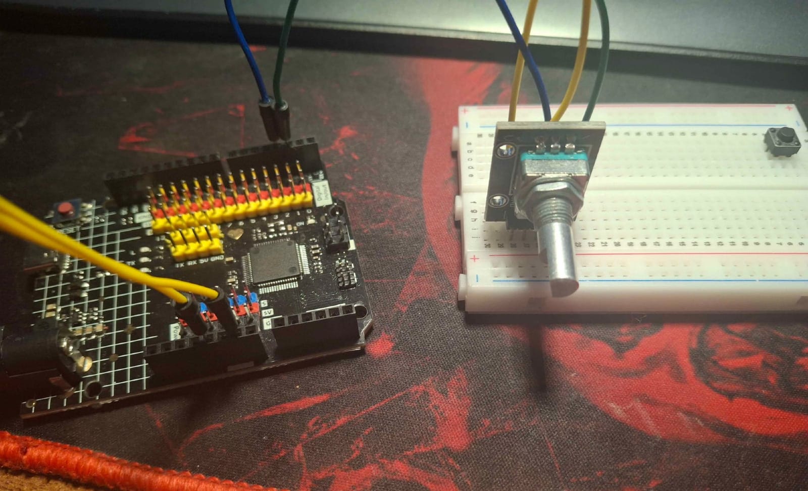Usually encoders will have a button integrated in them, so that when knob is pressed it acts as a button. That's why there is one extra pin that i did not connect, i don't need that button currently.