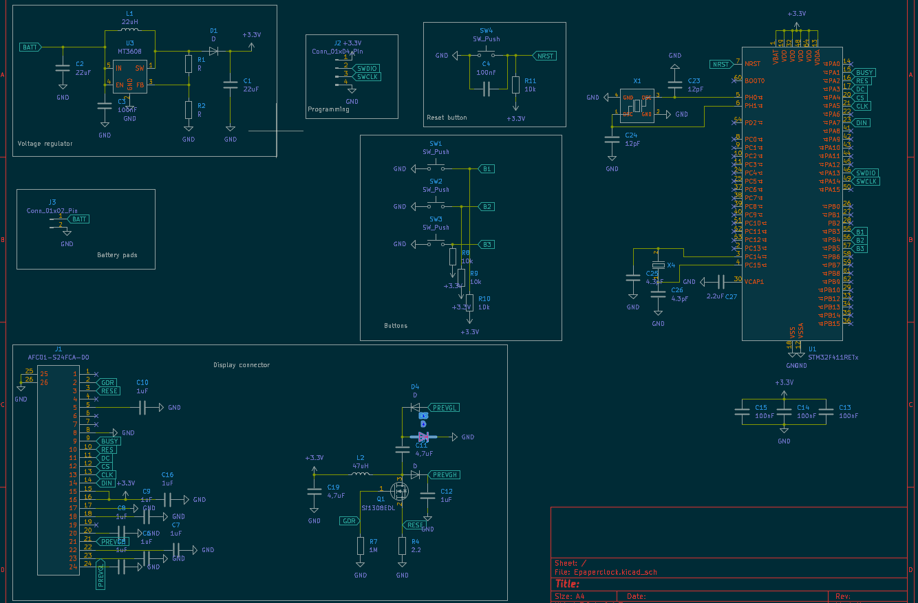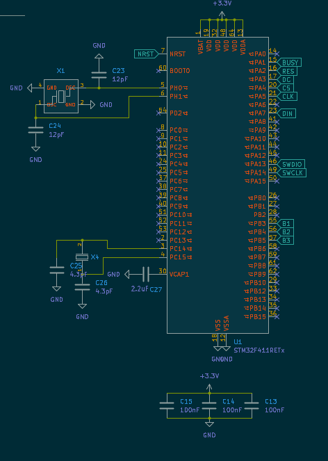 I should have noticed that while reading the datasheet, but I did not read the datasheet. But after examining schematic of a different development board I noticed two crystals with different frequencies, and one was 32.768kHz. Well that must mean something. So basically everything PCB needs to have is microcontroller, buttons, connector for display, and a couple of capacitors and resistors.